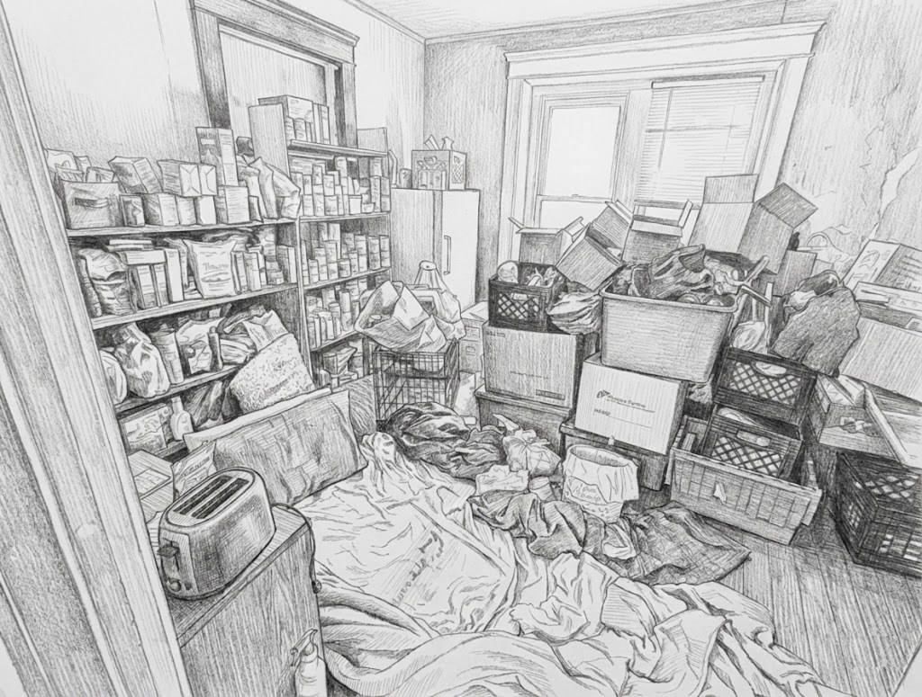 “Where She Slept” The dining room converted to a sleeping space — blankets on the floor, shelves of canned goods, boxes stacked to the ceiling. This was home.